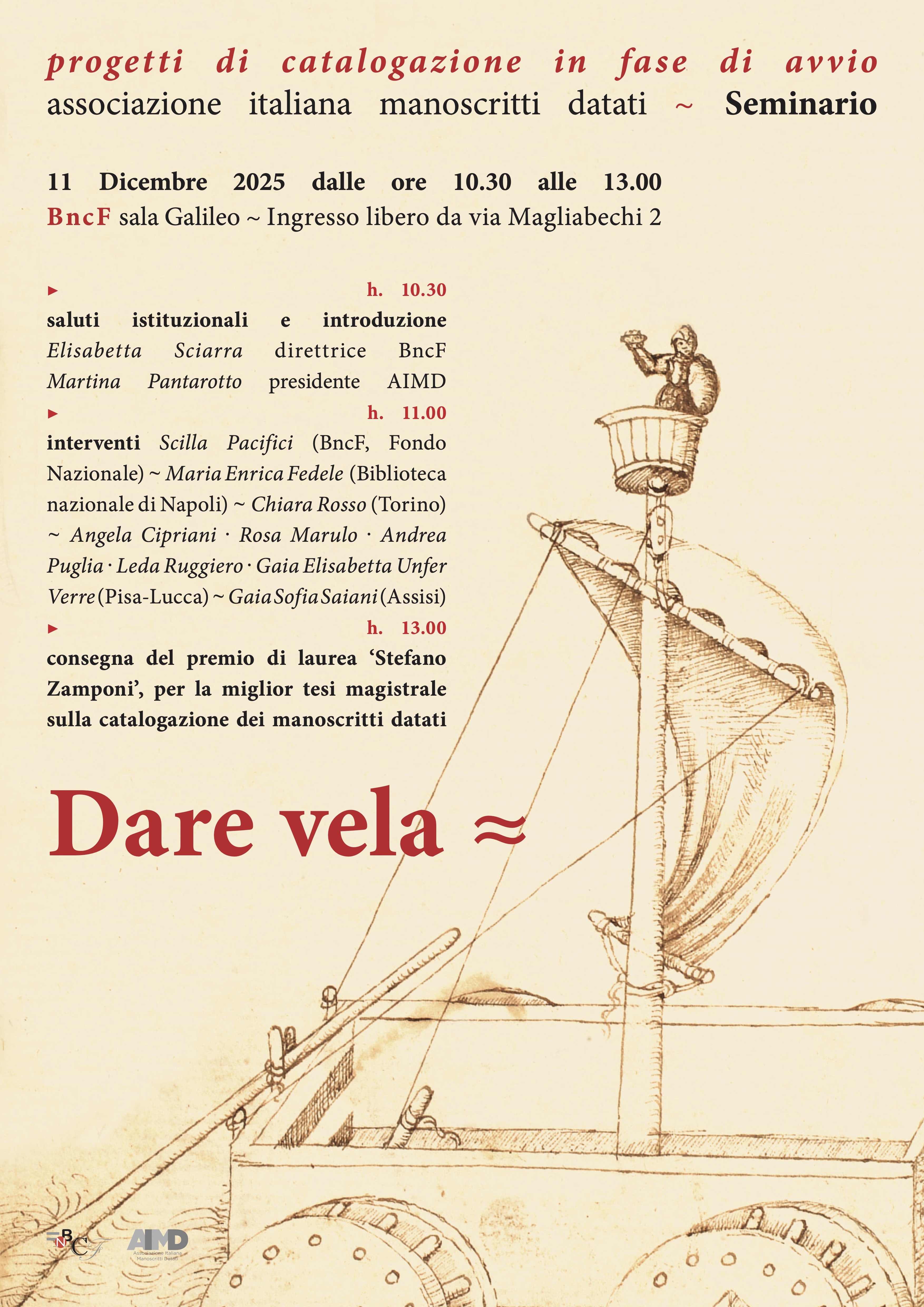 L’AIMD propone ai propri soci e al più ampio pubblico degli interessati un seminario dedicato ai progetti di catalogazione in fase d’avvio, per dar conto da un lato dell’articolata e vivace realtà dei lavori promossi, per sostenerne dall’altro le fasi iniziali attraverso un momento di riflessione condivisa. L’iniziativa si pone in continuità coi seminari promossi dal PRIN ScribIt e dell’AIMD presso la Biblioteca Teresiana di Mantova, la Biblioteca Estense Universitaria di Modena e la Biblioteca Nazionale Universitaria di Torino, concentrandosi su lavori non presentati nelle precedenti occasioni e che ancora si trovano nelle loro fasi iniziali. Intervengono: Scilla Pacifici (BncF, Fondo Nazionale), Maria Enrica Fedele (Biblioteca nazionale di Napoli), Chiara Rosso (Torino), Angela Cipriani · Rosa Marulo · Andrea Puglia · Leda Ruggiero · Gaia Elisabetta Unfer Verre (Pisa-Lucca), Gaia Sofia Saiani (Assisi)